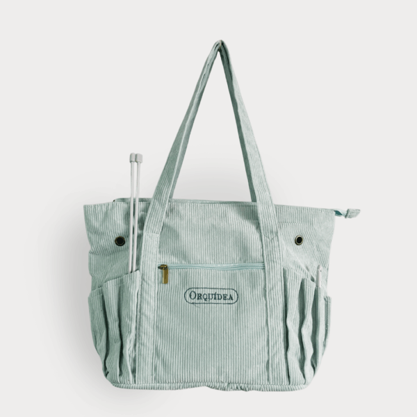 El Bolso Tejedora tiene el espacio y la organización que necesitas para llevar tus tejidos donde quieras. Cuenta con compartimentos interiores para guardar ovillos, espacios dedicados para palillos y crochet, y ojales que permiten tejer directamente desde el bolso sin enredos.