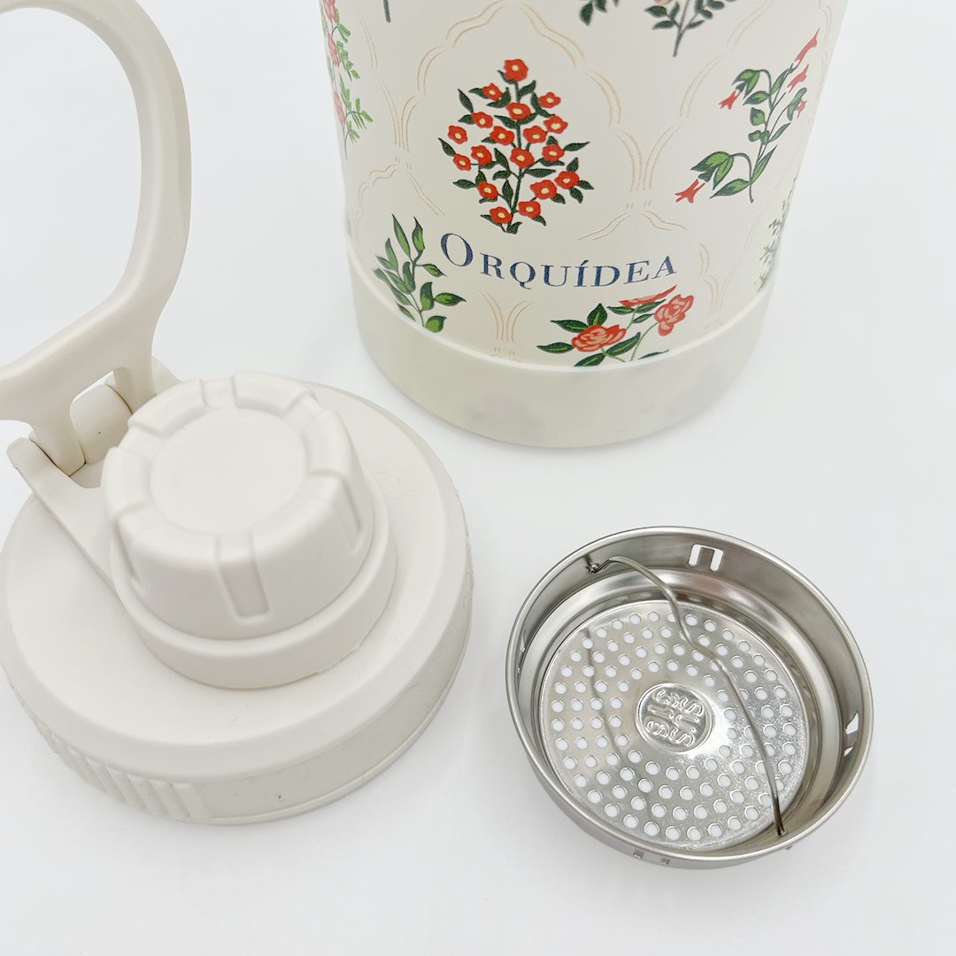 Fabricada en acero inoxidable, tiene una capacidad de 600 ml y un diseño con estampado floral en tonos verde menta, crudo y rosado. Incluye un asa para transportarla fácilmente y un filtro de acero inoxidable, perfecto para infusiones.
